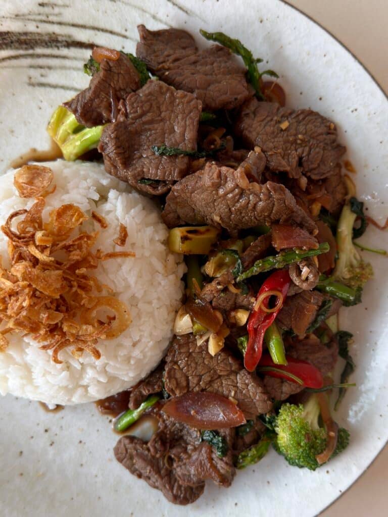נגיש בצלחת עם אורז וקריספי שאלוט מעל.