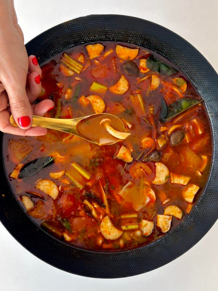 מוסיפים את כל שאר המצרכים ואת הכפיר ליים, מערבבים ומוסיפים את משחת הטום יאם ואת משחת הצ’ילי ושום בשמן (המתכון של המשחה באתר), בנוסף מוסיפים גם 4 כפות מהשמן הצף במשחת צ’ילי ושום.