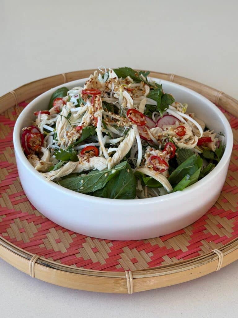 100 ג׳ חזה עוף מבושל (חלוט) במים (20 דק׳) מצונן וקרוע לשערות