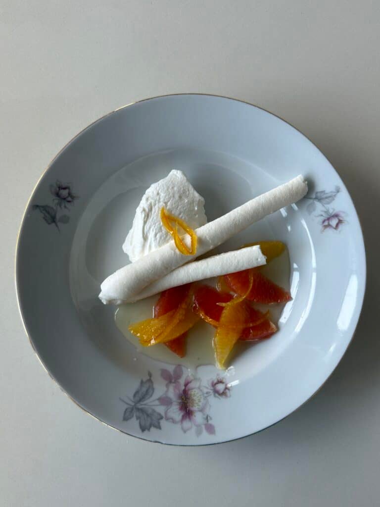 להגשה על צלחת מסדרים פילטים של פירות הדר ומעליהם את הקרם ואת המרנג ומעל הכל מזלפים מהסירופ.⁩⁩