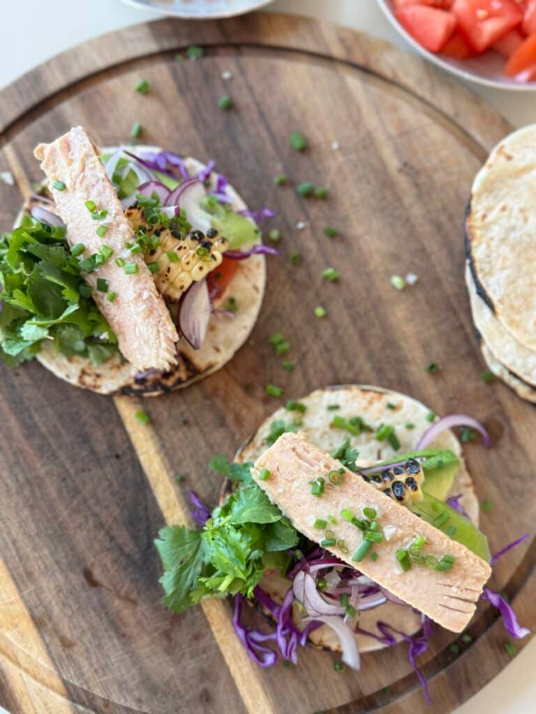 נרכיב את הטאקו – נמרח מהרוטב ונוסיף קצת מכל ירק, מעל הכל נשים נתח של פילה טונה, נפזר מלח ונסחט מיץ ליים.⁩