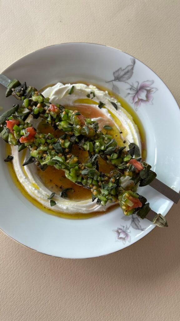 ונתחיל בצלחות- בקערה ניצור גומה (כמו חומוס) עם שמנת חמוצה, נשים מעל את שיפודי הבמיה ונמזוג את הויניגרט שהכנו, ומעל הכל נעטוף עם שמן זית ומעליו עלי זעתר.