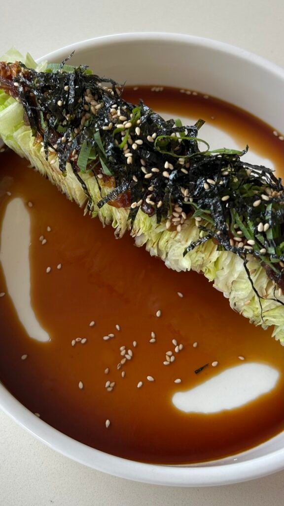 ונעבור לצלחות- נשים את החסה מעל לצלחת, נפזר בנדיבות את הרוטב מעל עם הבצל, ונקשט עם האצות הגזורות והבצל ירוק – ותהנו ! בתאבון !!