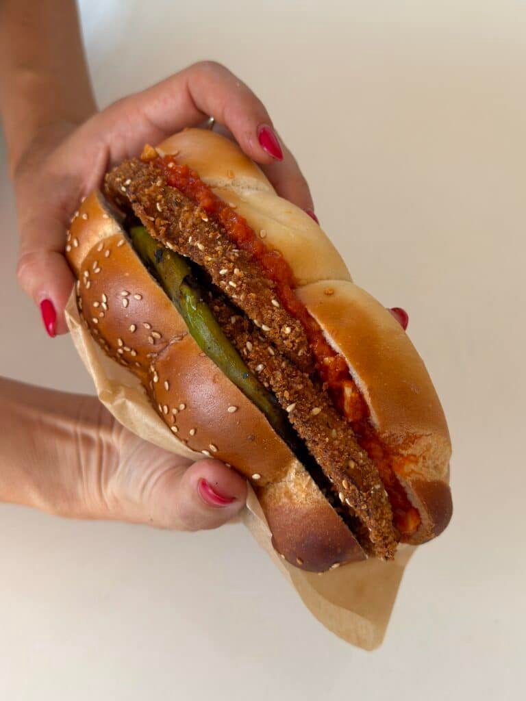 לאחר מכן לוקחים סטייק חציל וטובלים בבלילת ביצים, לאחר מכן מעבירים לציפוי הפירורי לחם. מועכים היטב את החציל לתוך הפירורים מספר פעמים עד הטמעת הפירורים בחציל היטב.